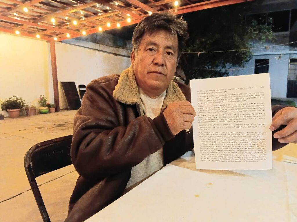 Indicó que “así mismo, existe inquietud y enojo por la falta de rendición de cuentas de varios ex comités de agua potable, de expresidentes de comunidad, de los encargados de cobro del panteón y del dinero que existe por los cobros y venta indiscriminada de la madera de nuestro monte”.